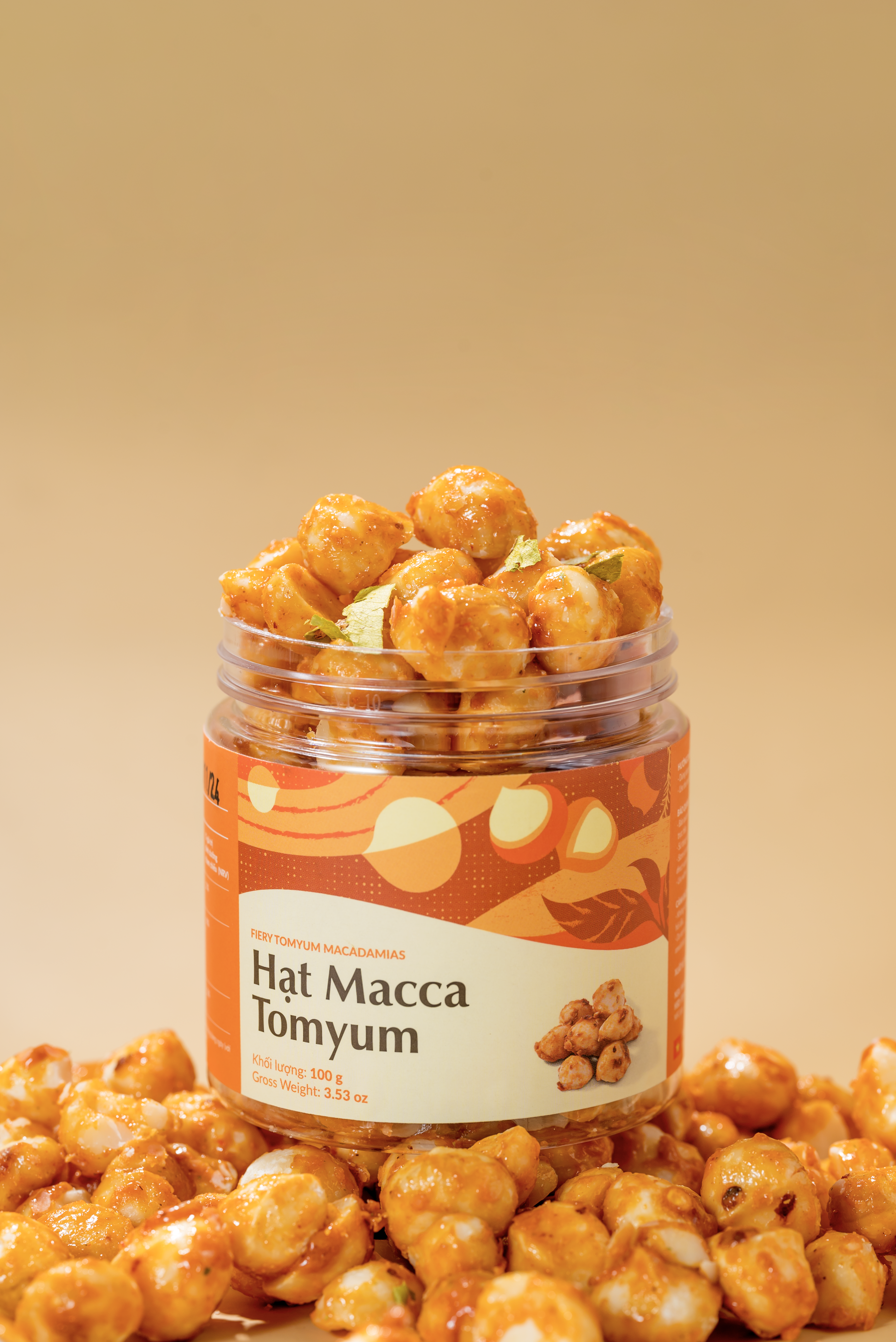 - Thành phần: Hạt macca (81 %), muối (1 %), đường (3 %), Tomyum chua cay độc đáo (5 %)